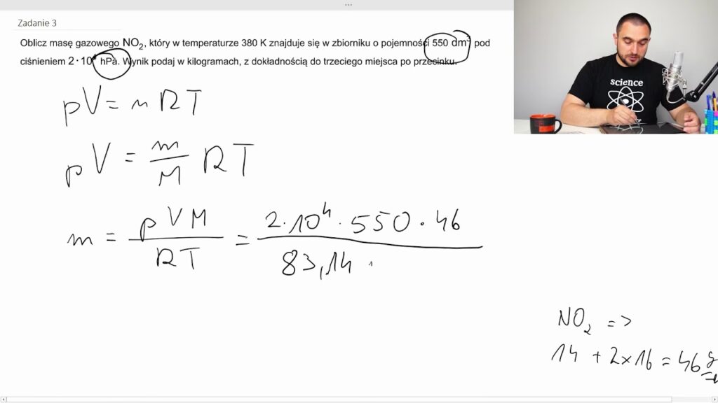 - Przeliczamy liczbę cząsteczek na mole: n = (2,0 · 1020 cząsteczek) / (6,022 · 1023 cząsteczek/mol) ≈ 3,321 · 10-4 mol.