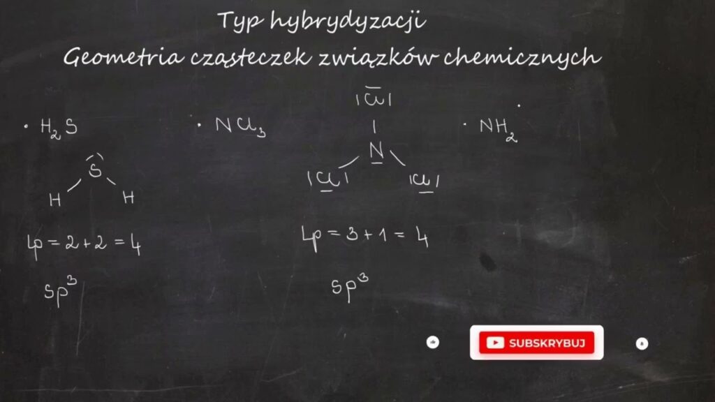 - Hybrydyzacja sp3: Odpowiada cząsteczkom o geometrii tetraedrycznej. Powstają cztery równocenne orbitale hybrydowe, skierowane ku narożom czworościanu (np. w metanie).