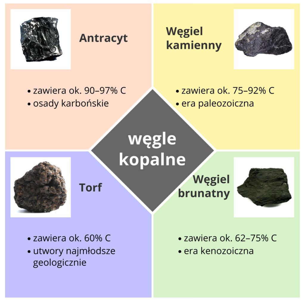 | Węgiel kamienny | Stały | Węgiel (C) | Koksowanie, Zgazowanie |
