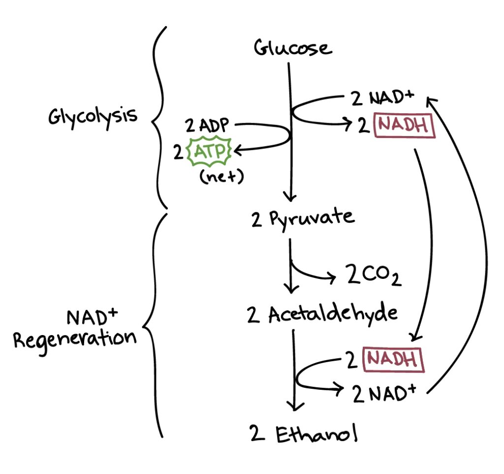 Przebiega z udziałem drożdży oraz niektórych bakterii. W tym procesie glukoza jest przekształcana w alkohol etylowy (etanol) i dwutlenek węgla. Jest to proces kluczowy dla: