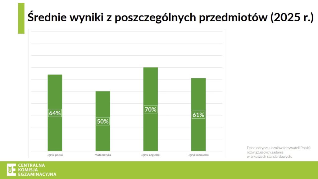 Wyniki egzaminu ósmoklasisty są przedstawiane w procentach dla każdego z trzech obowiązkowych przedmiotów: języka polskiego, matematyki i języka obcego nowożytnego. Te procenty są następnie przeliczane na punkty rekrutacyjne za pomocą specjalnych mnożników. Oto jak to wygląda: