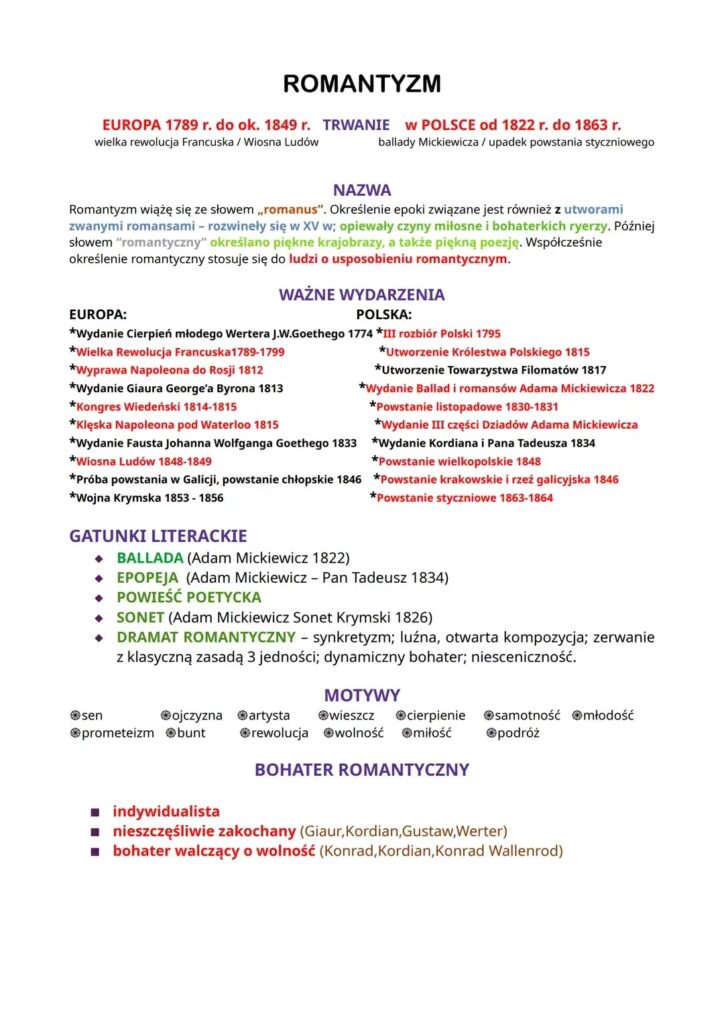 - Patriotyzmie i kwestiach narodowowyzwoleńczych: W przypadku Polski, romantyzm był ściśle związany z walką o niepodległość i budowaniem narodowej świadomości.