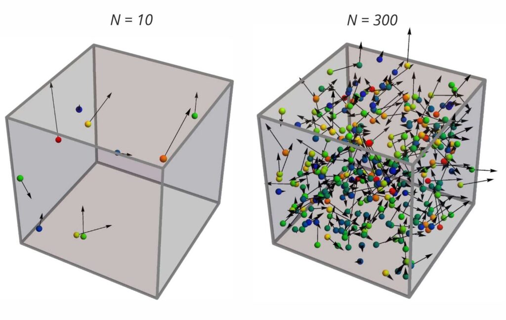 - Duża Liczba Cząsteczek w Ciągłym, Chaotycznym Ruchu: Gaz składa się z ogromnej liczby identycznych cząsteczek, które poruszają się w sposób ciągły, losowy i chaotyczny, zgodnie z prawami dynamiki Newtona.