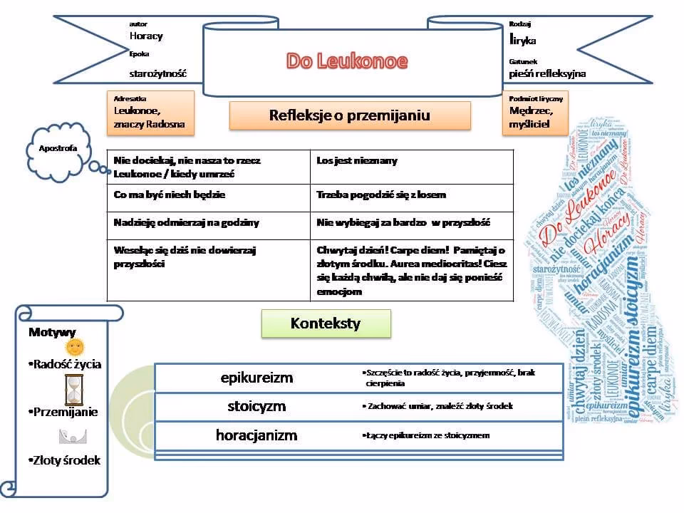 Kluczowym elementem jego filozofii jest również słynne zawołanie Carpe Diem – chwytaj dzień. Nie jest to zachęta do hedonizmu czy beztroskiego życia, lecz raczej do świadomego i pełnego wykorzystywania każdej chwili, bez nadmiernego martwienia się o przyszłość czy rozpamiętywania przeszłości. Horacy zachęcał do umiaru we wszystkim, do znajdowania równowagi między pracą a odpoczynkiem, między ambicją a zadowoleniem z tego, co się ma. Jego poezja jest pełna refleksji moralnej, rozważań o nieuchronności śmierci i wartości umiarkowanego, rozumnego życia. Nadawał swoim uczuciom i chwilowym nastrojom formę uniwersalną, która przemawiała przez wieki, stając się jednym z fundamentów europejskiej tradycji literackiej.