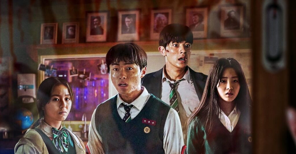 - All Of Us Are Dead (2022): Być może najbardziej niekonwencjonalna K-drama osadzona w szkole, śledząca grupę uwięzionych licealistów, którzy walczą o przetrwanie w obliczu wybuchu epidemii zombie. Ten horror zombie to intensywna historia o dorastaniu, gdzie przemoc i rzeź ogarniają szkolne korytarze. Serial umiejętnie łączy ponurą naturę thrillerów zombie z humorem i niepokojem dram nastoletnich.