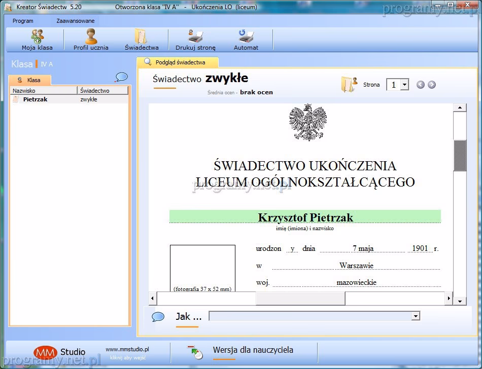 O: Darmowy program to Generator dostępny na stronie mac.pl/generator-swiadectw, w aktualnej wersji v4.11.2.