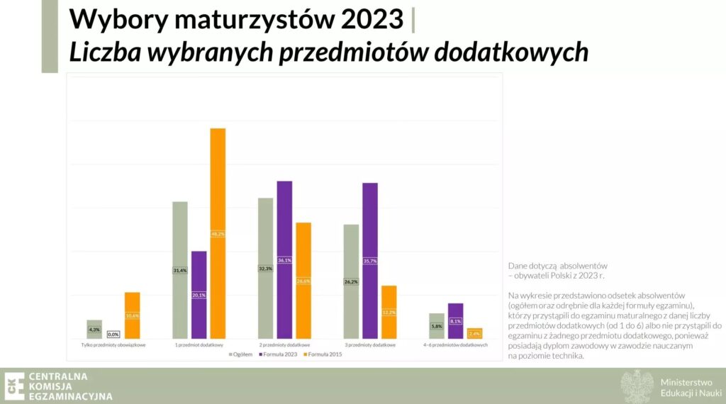 Oprócz tego jednego obowiązkowego przedmiotu dodatkowego, maturzyści mają możliwość wyboru do pięciu innych przedmiotów, zdawanych na poziomie rozszerzonym. Jest to ogromna szansa na zaprezentowanie swoich mocnych stron i pogłębionych zainteresowań, co jest niezwykle cenne w procesie rekrutacji na studia. Pula przedmiotów dodatkowych jest bardzo szeroka i obejmuje zarówno nauki ścisłe, humanistyczne, jak i języki obce: