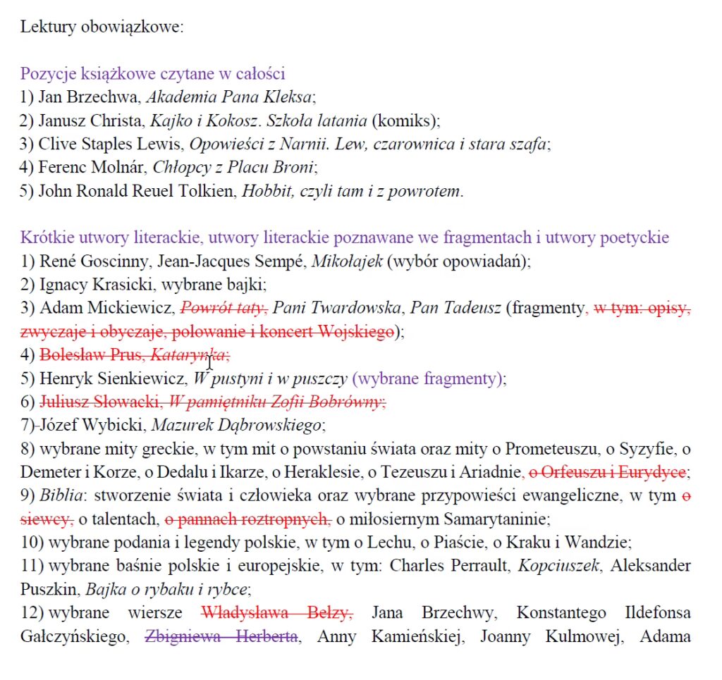 Z listy lektur obowiązkowych na poziomie podstawowym w liceum i technikum „zniknęły” m.in. takie pozycje jak: