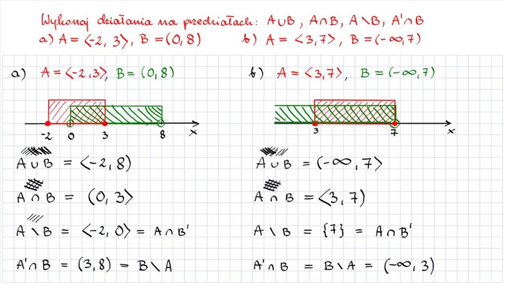 - Iloczyn Przedziałów (∩): Zbiór wszystkich liczb należących do obu przedziałów jednocześnie. Np. (1, 3) ∩ [2, 4] = [2, 3). Rysując oba przedziały i szukając części wspólnej (obszaru, gdzie linie się nakładają), znajdujemy iloczyn.