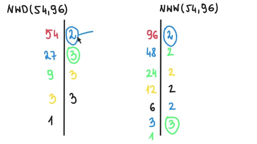 - Pomnóż zaznaczone czynniki – ich iloczyn to NWD. Jeśli dany czynnik występuje w rozkładach obu liczb z różną potęgą, bierzemy ten z niższą potęgą.