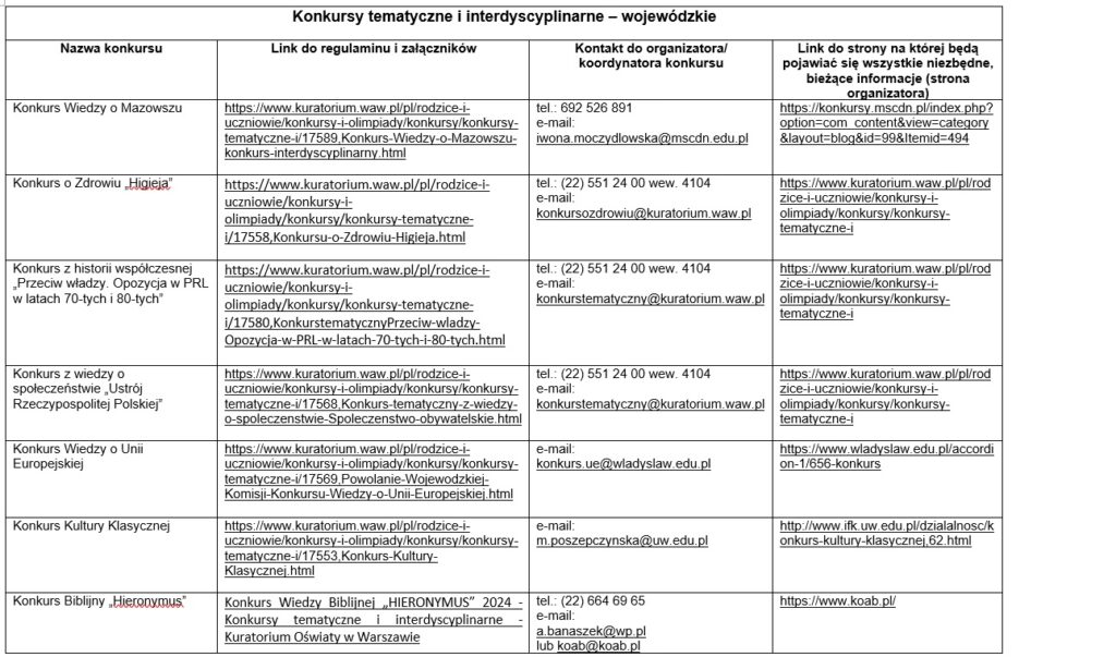 Wielu kuratorów oświaty na swoich stronach internetowych publikuje listy konkursów przedmiotowych i tematycznych, które są premiowane w rekrutacji. Warto regularnie sprawdzać te strony, ponieważ listy te mogą się różnić w zależności od regionu i być aktualizowane co roku. Są to często zawody wiedzy o zasięgu ponadwojewódzkim lub wojewódzkim, które są uznawane za szczególnie prestiżowe.