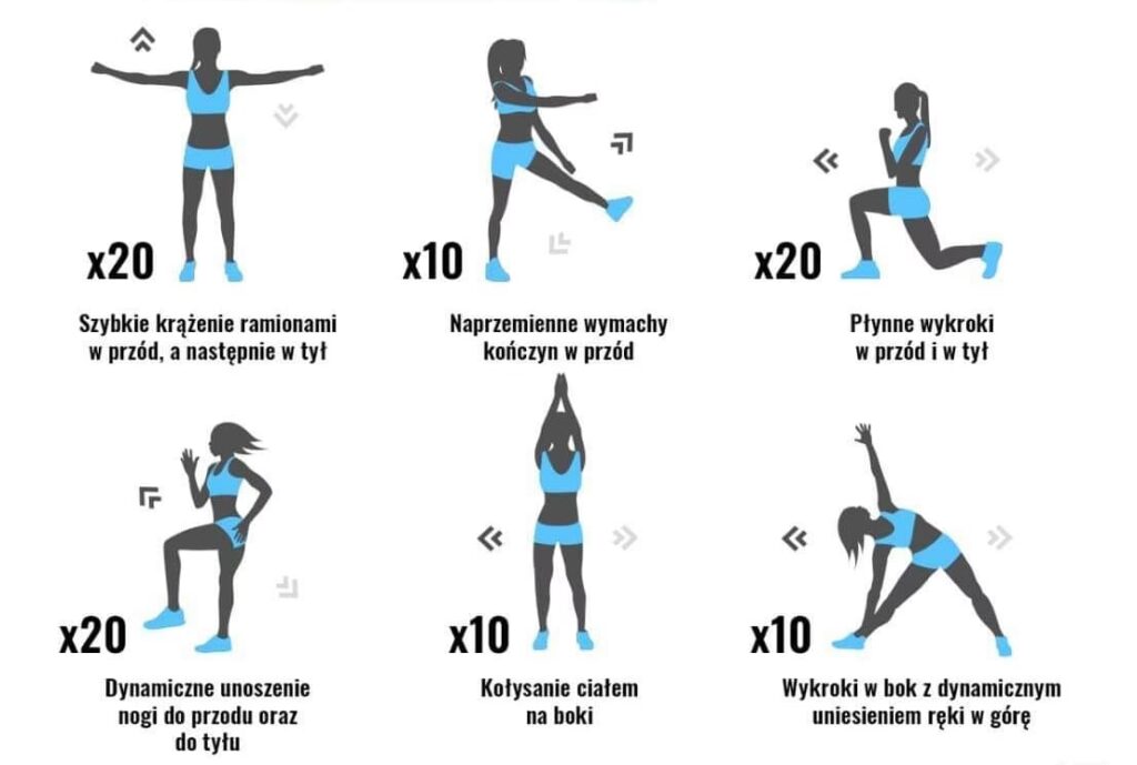 • Krążenia w stawach: Zacznij od nadgarstków, szyi, a następnie przejdź do barków, stawów skokowych, bioder i kolan. Wykonuj ugięcia, wyprosty, przysiady.