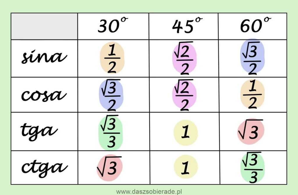 - Zapamiętywanie wzorów i wartości: Trygonometria wymaga znajomości wielu wzorów oraz wartości funkcji trygonometrycznych dla kluczowych kątów (np. 0°, 30°, 45°, 60°, 90°). Nauczenie się ich na pamięć może być uciążliwe. Obejmuje to również bardziej złożone wzory, takie jak prawa sinusów i cosinusów.