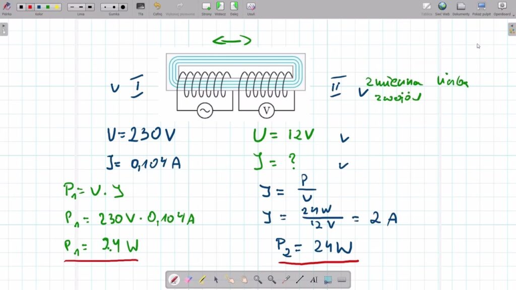 | Moc w idealnym transformatorze | Pp = IpVp = IsVs = Ps | Moc wejściowa (Pp) jest równa mocy wyjściowej (Ps), co oznacza, że transformator nie generuje ani nie pochłania mocy. |
